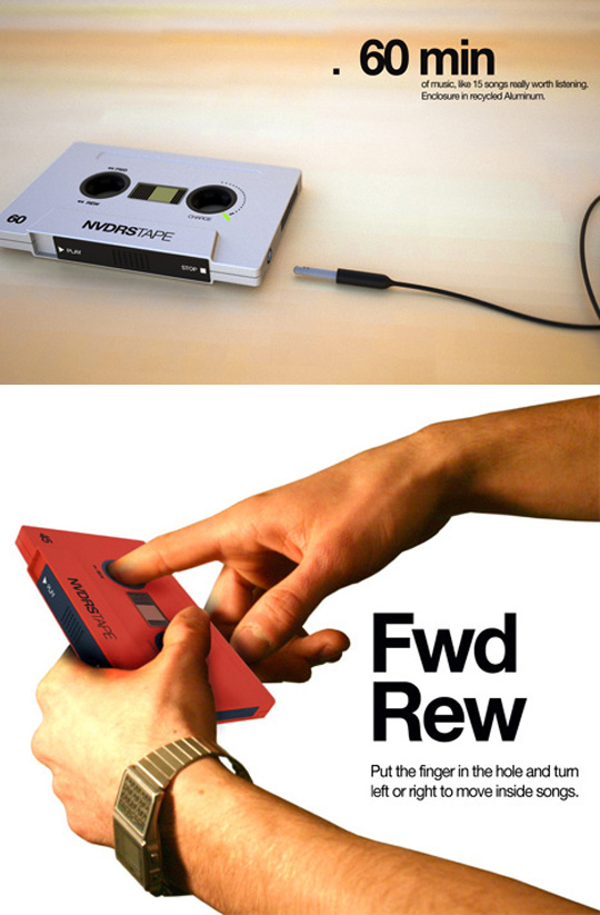 It really gets no better than a stripped down cassette shaped mp3 player. This conceptual work of wonder comes complete with hideaway USB connector, headphone jack, and a tiny screen that shows elapsed song time. Add in the fact that charging and song changing are done by twisting the tapes spools and it becomes crystal clear that I need one of these immediately.