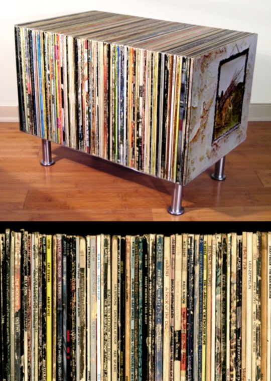 What better way to make use of your collections of dollar bin gems and empty vinyl covers than to create a side table. The Album Side Table by Bughouse shows what can be done with a bunch of common records and little ingenuity.